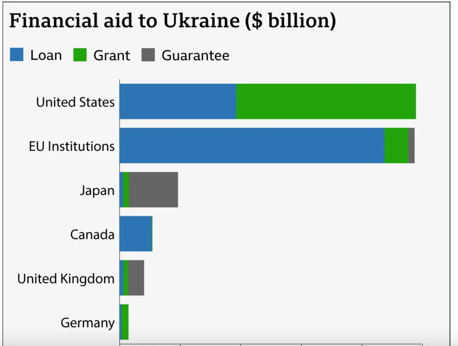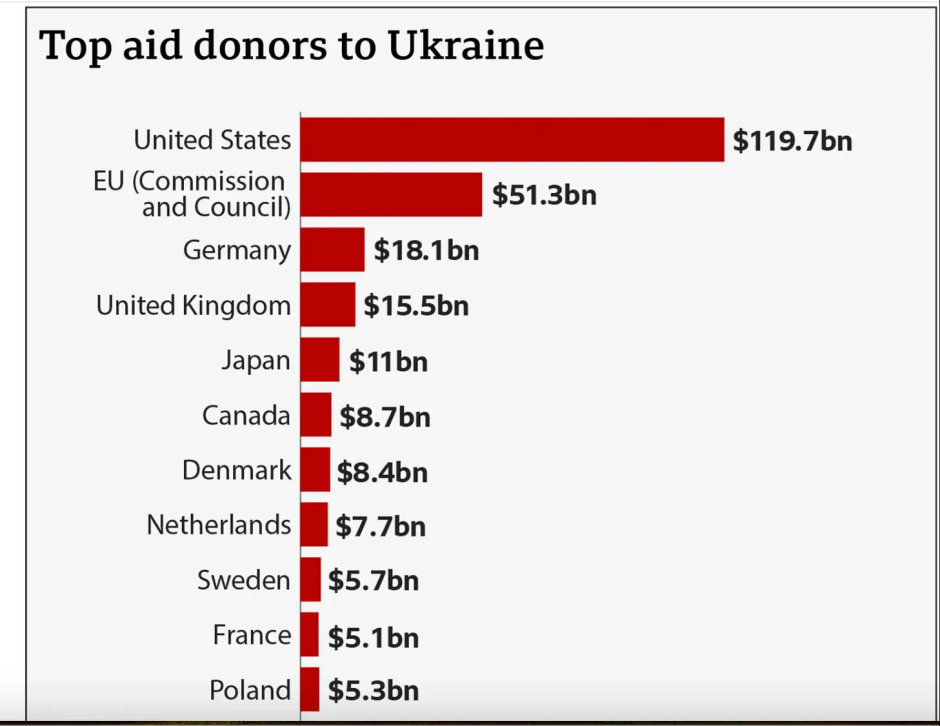 President Trump says that the US has spent $300-350 billion dollars on defense of Ukraine. The BBC argues that it is much less - $119.7 billion. But still, the outsize amount that America has provided is stunning to consider, in relation to Europe's far more limited contributions. The BBC's chart below shows that our $119.7 billion contrasts sharply with France's $5.1 billion and the EU's $51.3 billion. Add to this disparity the fact that the vast majority of Europe's funds heading to Ukraine, arrive in the form of loans, not grants, as opposed to the outright wealth transfers made by the United States. In other words, in theory at least, the money with which Europe is parting, is not meant to be lost to European lender nations forever.