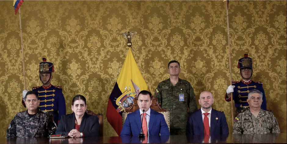 Lorsque, dans un climat de fortes tensions, des mutineries avec prises d'otages éclatent simultanément dans les établissements pénitentiaires et que plusieurs policiers sont enlevés, Noboa annonce, le 9 janvier 2024 :