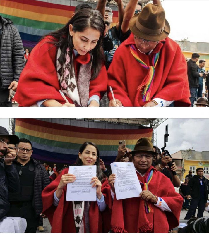 Ce pacte a une importance capitale. Fer de lance de la contestation néolibérale dans les années 1990, acteur majeur du renversement des présidents Jamil Mahuad en 2000 et Lucio Gutiérrez en 2005, le mouvement indigène s'est considérablement « droitisé » ultérieurement. Ayant rejoint les secteurs conservateurs et pro-américains, une faction de « ponchos dorés » financée en sous-main par l'USAID et ses ONG – Lourdes Tibán, Marlon Santi, Salvador Quishpe, etc. – a pris le dessus au sein du bras politique Pachakutik. Un « anti-extractivisme » parfois sans nuances, partagé avec les jeunes écologistes urbains de la classe moyenne, a mené à des relations conflictuelles avec Correa. Que ce soit en 2021 et en 2023, un vote d'opposition, puis un vote « nul idéologique » des Indigènes au second tour de la présidentielle ont permis aux beaux messieurs et aux belles dames de l'emporter. Seulement, et en retour, Lasso et Noboa n'ont fait aucun cadeau. Cela finit par se remarquer. A la tête de la CONAIE, a été élu Leonidas Iza. Populaire à la base, il a mené les vigoureuses luttes sociales qui ont fait trembler Moreno et Lasso. Homme de gauche moins enclin à s'opposer systématiquement à la Révolution citoyenne, Iza considère que, la droite étant unie, il est impératif d'unir les forces de gauche pour éviter une nouvelle victoire de Noboa.