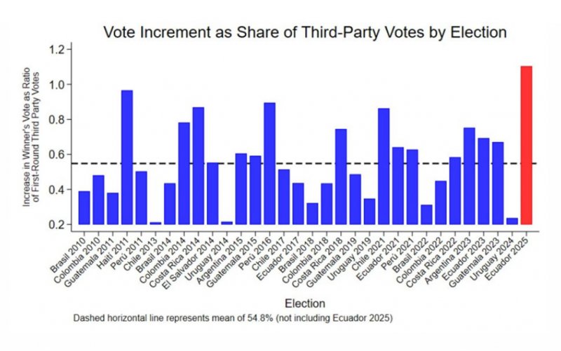 Augmentation des voix en pourcentage des votes des tiers partis par élection. La ligne horizontale en pointillés représente la moyenne de 54,8 % (hors Equateur 2025).