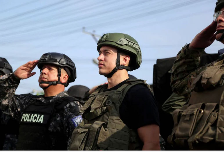 Plan Fénix : construction prévue de deux prisons à Pastaza et Santa Elena – sur le modèle concentrationnaire salvadorien. Dans quelques temps, Noboa envisagera même d'en établir une dans l'Antarctique – va savoir comment et pourquoi. Il décrète en tout cas l'existence d'un « conflit armé interne » et déclare « groupes terroristes » vingt-et-une bandes délinquantes – Aguilas, Aguilas Killer, Ak47, Caballeros Oscuros, ChoneKiller, Choneros, Corvicheros, Cuartel de las Feas, Cubanos, Fatales, Ganster, Kater Piler, Lagartos, Latin Kings, Lobos, Los p27, Los Tiburones, Mafia 18, Mafia Trebol, Patrones, R7 y Tiguerones. Fort de cette justification – le « terrorisme » –, le pays va désormais d'état d'exception en état d'exception. Les militaires sont jetés dans la rue.