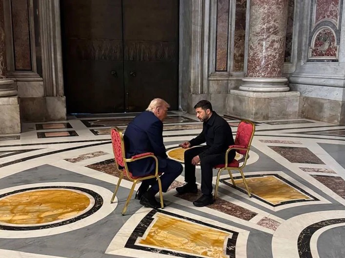 Donald Trump recueille la confession Volodymyr Zelensky, le 26 avril 2025, dans la basilique Saint-Pierre de Rome.