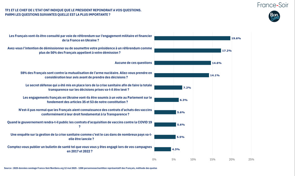 Interrogés sur les questions qu'ils souhaitent voir abordées par Emmanuel Macron lors de son intervention télévisée du 13 mai 2025 sur TF1, les Français placent en tête un référendum sur l'engagement militaire et financier en Ukraine (21 %), suivi de la question de sa démission (18 %) et de la mutualisation de l'arme nucléaire (15 %), à laquelle 60 % s'opposent. La transparence sur la gestion de la crise sanitaire, notamment les contrats d'achat des vaccins covid-19 (65-68 % jugent cela important), figure également parmi les priorités.