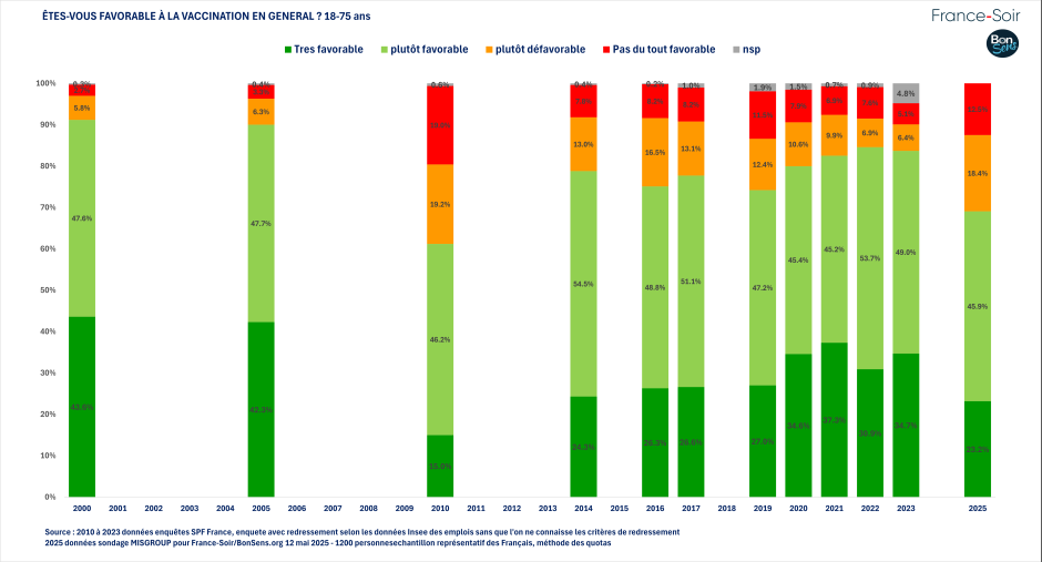 - L'adhésion à la vaccination a donc fortement diminué depuis 2023, avec le nombre de très favorable qui atteint son second score le plus bas depuis que le baromètre de santé publique France existe. L'accroissement des personnes défavorables et pas du tout favorables à la vaccination est notable à 31 %, ayant pratiquement plus que doublé depuis 2023.