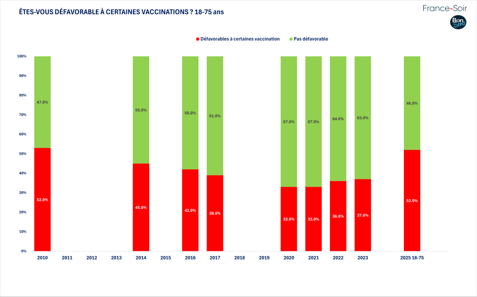 Cependant, 52 % expriment des réserves sur certains vaccins. Une augmentation très marquée depuis 2023, où 37 % exprimaient des réserves.