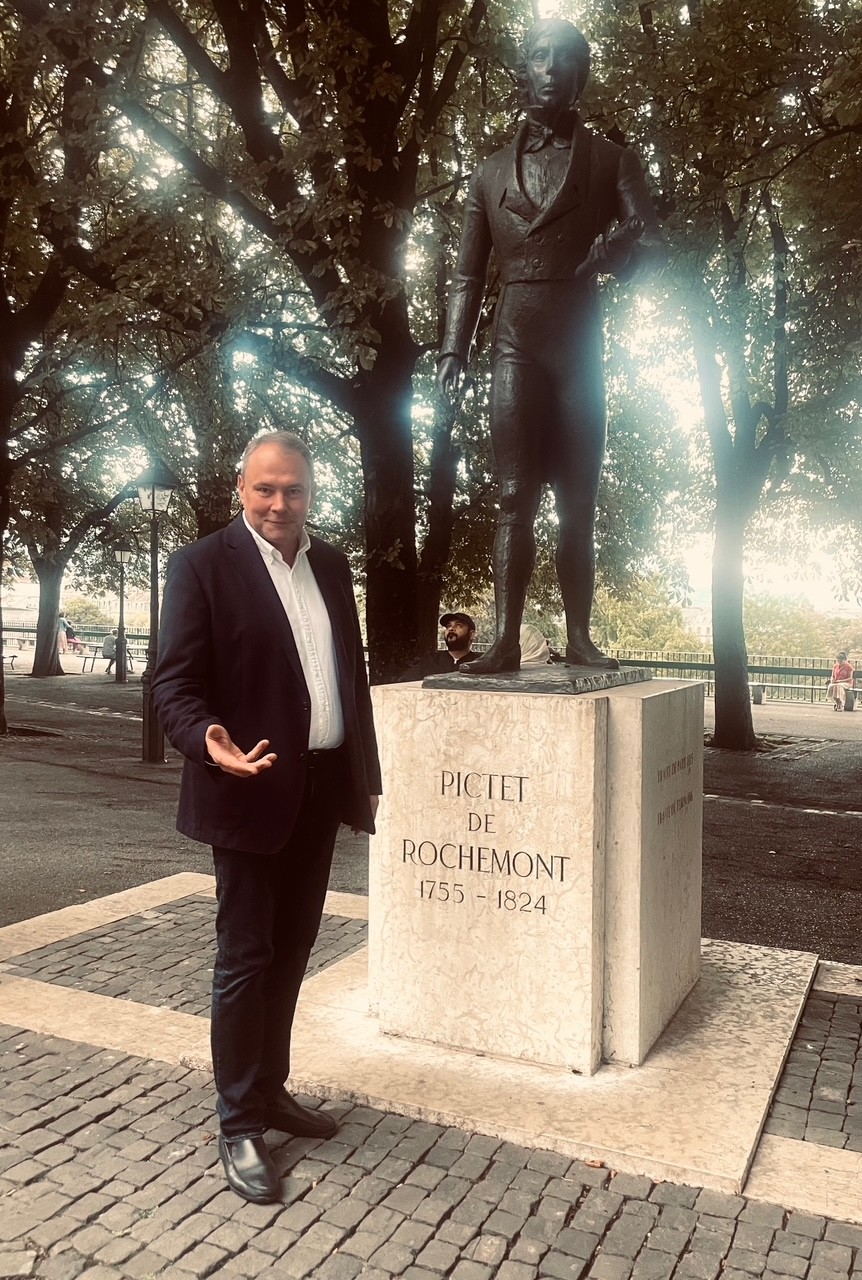 Piotr Tolstoy à Genève, devant la statue de Pictet de Rochemont, le diplomate qui avait négocié le rattachement de Genève à la Confédération et contribué à la reconnaissance de la neutralité de la Suisse au Traité de Vienne en 1815 grâce à ses bonnes relations avec le tsar Alexandre 1er. © DR