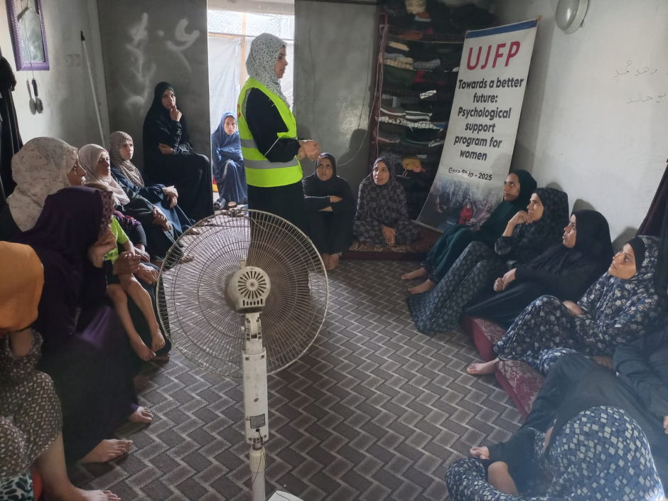 Les femmes du camp de Durra, à l'ouest de Deir al-Balah, vivent quotidiennement entre deux luttes : celle de la survie matérielle et celle de la résilience psychologique. La peur ne s'éteint pas avec la fin des bombardements ; elle demeure, telle une ombre longue et persistante, tapie dans la poitrine. L'équipe UJFP continue de tendre la main pour tirer les femmes du gouffre du découragement et du désespoir, en offrant des séances de soutien psychologique pour bâtir des stratégies pratiques redonnant aux femmes la capacité de retrouver leurs identités fragmentées.