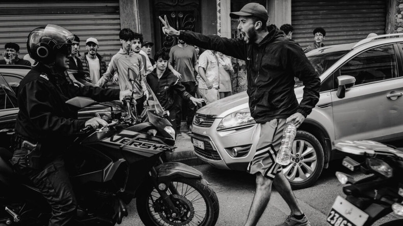 Un manifestant marocain scande le signe de la victoire face à un policier sur une moto.