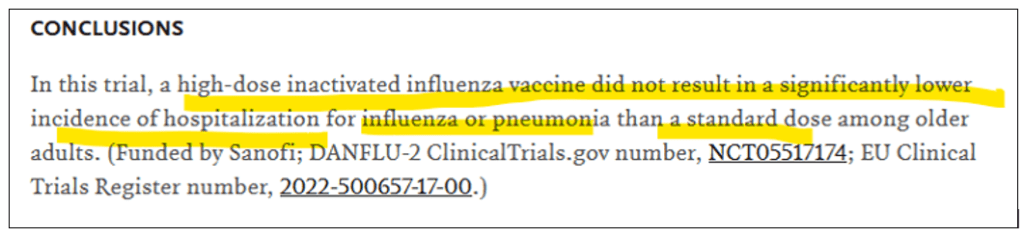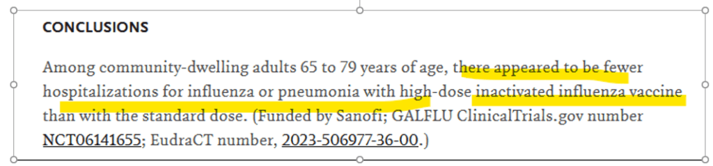 Conclusion en français : l'étude est complètement négative ! Les vaccins hautement dosés ne sont pas plus efficaces que leurs prédécesseurs qui eux-mêmes ne l'étaient pas.