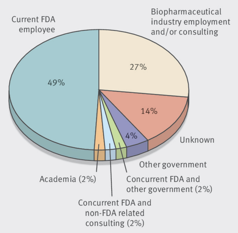 The most common career path for someone after working at the FDA is to join the pharmaceutical industry. For example, in 2016, Vinay Prasad  published a study of the fate of the FDA's 55 reviewers for hematology and oncology drugs (one of the most profitable drug sectors), finding that over half of them had entered the industry they regulated.