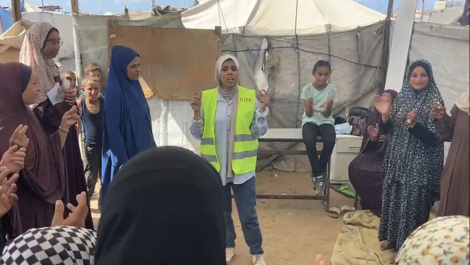 « Dans le camp Al-Irada, à l'ouest de Deir al-Balah, trente femmes déplacées se sont réunies dans une tente. Des femmes alourdies par des années de déplacement, l'amertume de la guerre, la privation et la perte de contrôle, traînant derrière elles la mémoire des conflits et des pertes successives. Pourtant, ce matin-là, elles s'assirent en cercle autour d'une équipe de l'UJFP venue leur offrir une occasion de redécouvrir l'espoir.