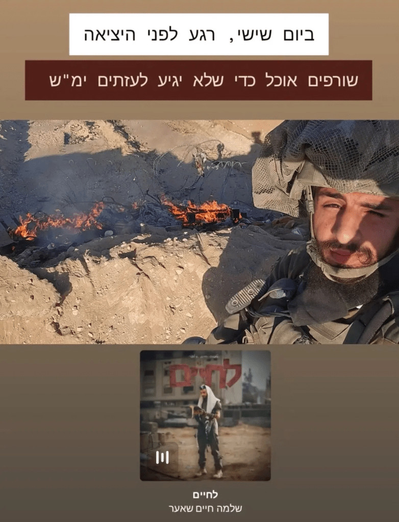 Dimanche, un soldat israélien de la brigade Kfir a publié une photo de lui debout devant des palettes en bois en feu. «Vendredi, juste avant le départ. Brûler de la nourriture pour qu'elle n'atteigne pas les Gazaouis, que leurs noms soient effacés», peut-on lire en légende. La publication inclut également une chanson intitulée «L'Chaim !» (Santé !), dont le clip utilise des images de Gaza.