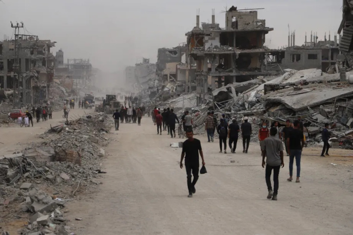 16 octobre 2025 - Des Palestiniens retournant dans le quartier de Sabra, après l'entrée en vigueur du supposé « accord de cessez-le-feu », marchent parmi les bâtiments détruits lors des attaques menées par l'armée israélienne sur la ville de Gaza - Photo : Khalil Ramzi Alkahlut / AA
