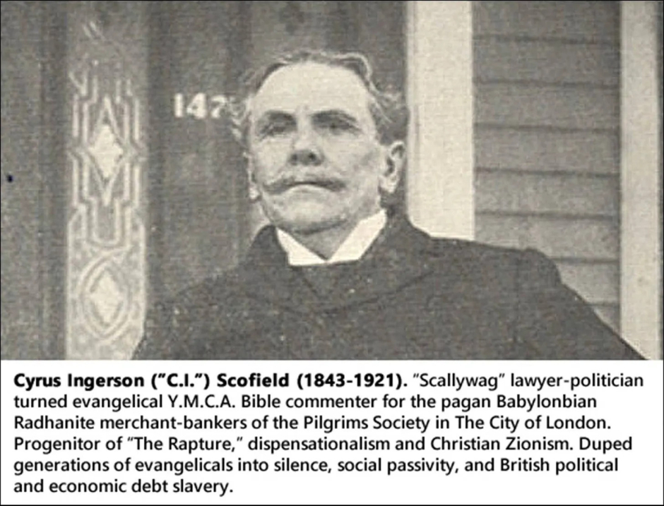 Not that long ago, I started hearing a lot about the Scofield Bible, which birthed the evangelical movement just as surely as Joseph Smith's Book of Mormon birthed theirs. Mormons are scoffed at by all other Christians, but Scofield Christians not only are tolerated, and even respected, they have become the face of modern Christianity in America 2.0. A pastor named Cyrus Scofield, who had a murky past which included abandoning his wife and children, bribery and theft of contributions, was chosen by powerful Jewish financiers like Samuel Untermeyer to add suitably pro-Zionist footnotes in what became the Scofield Reference Bible, which first appeared in 1909. This reference Bible was published and is still owned by the Oxford University Press. The footnotes were carefully selected, to all reflect a pro-Zionist perspective. Although Zionism was largely unheard of at the time, the goal was to make the Bible stress Jesus's Jewishness, and the fact that the Jews were the "chosen" people of God.