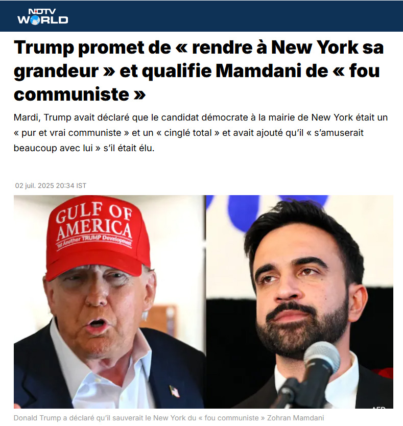 Sur sa plateforme de médias sociaux Truth Social, Trump a traité Mamdani de « Fou communiste à 100 pour cent ». D'autres prétendent qu'il veut introduire la charia, qu'il accueillerait une nouvelle attaque du 11 septembre, et que son élection serait un danger pour les Juifs partout.