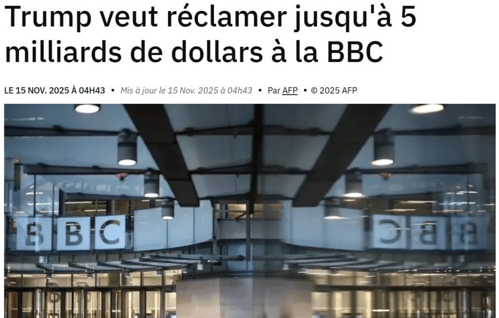 Trump annonce maintenant qu'il va réclamer entre 1 et 5 milliards de dollars à la BBC pour l'avoir diffamé en bidonnant un documentaire visant à le faire passer pour l'organisateur d'une tentative de coup d'État aux États-Unis.