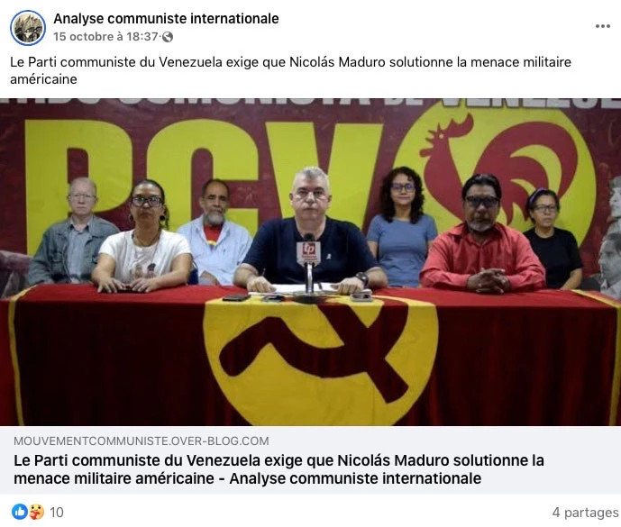 Reste la bataille de l'« international ». Pour l'heure, les « figueristes » ont le dessus. « Ils frayent avec l'extrême droite, mais on les croit communistes, lâche Griseldys Herrera. Ils tiennent parce qu'ils ont conservé les réseaux du parti. » Sans gravité exceptionnelle lorsque le sous-groupuscule PCRF (Parti communiste révolutionnaire de France) organise une collecte de fonds pour soutenir Tribuna Popular, organe du PCV « soumis à une persécution intolérable de la part de l'Etat vénézuélien et du gouvernement social-démocrate de Nicolas Maduro » [35]. Moins anecdotique lorsqu'une délégation « figueriste » figure à la Fête de l'Humanité (12 au 14 septembre 2025), invitée par un Parti communiste français (PCF) peu informé et divisé, ou pour le moins troublé par la situation (bien qu'à la base, du fait de sa proximité avec Cuba, la cause de la Révolution bolivarienne déclenche de la sympathie).