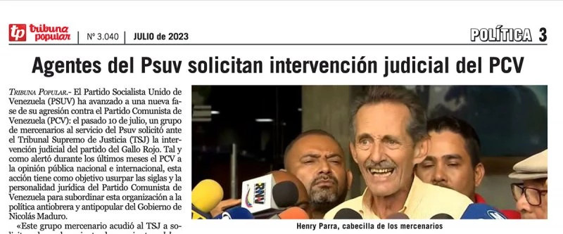 Ces dures accusations semblent confirmées quand, le 11 août 2023, le Tribunal suprême de justice (TSJ) annonce la destitution de la direction du PCV, jugée « illégitime », et son remplacement par une direction ad hoc, chargée de « rétablir les processus démocratiques au sein du parti ». Un mois auparavant, Figuera avait accusé « un groupe de mercenaires au service du PSUV » - « une poignée de figures apparemment inconnues déclarant être les bases du PCV » précisa Tribuna Popular, l'organe du parti - de solliciter cette spoliation.