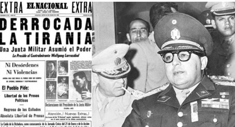 La police politique de Pérez Jiménez multiplie exactions et arrestations. Les diverses oppositions s'agrègent. Depuis le début de 1957 il existe, en exil, une Junte patriotique (JP) dirigée par le journaliste Fabricio Ojeda (Union républicaine démocratique ; URD). En font partie à haut niveau Silvestre Ortiz Bucarán (AD), Enrique Aristiguieta Gramko (Copei ; social-chrétien) et Guillermo García Ponce du PCV. Aucun des membres de cette junte n'a plus de trente-cinq ans. Grâce au parti communiste, la JP a des liens avec certains militaires. Le 1er janvier 1958, sous les ordres du colonel Hugo Trejo, une faction de l'armée se soulève. Partie de Maracay, une escadrille lâche quelques bombes sur Caracas. L'opération échoue. Du moins, en apparence. La colère populaire prend de l'ampleur. Le 5 janvier, lors d'une manifestation à El Silencio (Caracas), les brigades de choc du PCV font pour la première fois usage de leurs armes. La Junte patriotique lance un appel à la grève générale. Les ouvriers du pétrole posent leurs outils. L'Eglise soutient officiellement la cause des conjurés. Caracas se hérisse de barricades. Le peuple laisse exploser sa colère. Jusque-là loyaux au dictateur, les chefs de la Force armée nationale sentent le vent tourner. Le 23 janvier, les armes à la main, les cellules du PC participent à l'apogée. Pour échapper à l'émeute, Pérez Jiménez saute dans un avion. Les valises bourrées de 300 millions de dollars, il s'enfuit à l'étranger.