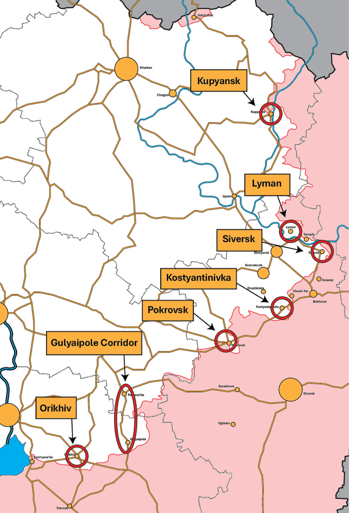 Koupiansk est en grande partie sous contrôle russe. Au cours des derniers jours, les forces russes ont pris environ 25% de Siversk. Pokrovsk est à 95% aux mains des Russes. Les combats dans sa ville jumelle encerclée, Mirnograd, touchent lentement à leur fin. La route entre Pokrovsk et Houliaïpole a été prise. Cette dernière ville est donc coupée de sa principale ligne d'approvisionnement et sera bientôt encerclée.