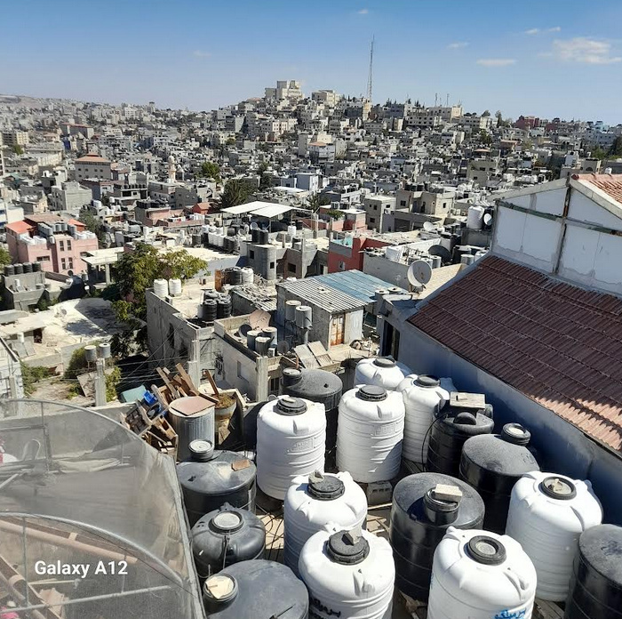 Israël contrôle l'accès à l' eau des Palestiniens, dont les citernes disposées sur les toits des maisons, sont alimentées tous les 15 jours : alors que les Israélien-es, et en particulier les colons, ont une utilisation sans limite de l'eau, les Palestinien-es sont rationné-es.