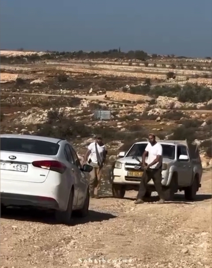 Des colons israéliens armés, protégés par l'armée, terrorisent des journalistes palestiniens et fouillent leurs véhicules près de la ville de Beit Ula, à l'ouest d'Hébron, en Cisjordanie occupée.