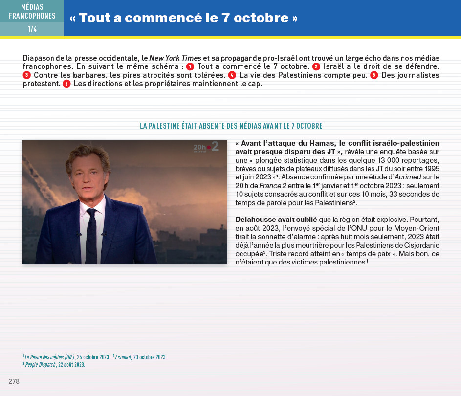 Les observatoires des médias - Acrimed, Arret sur Image, Les Mots Sont Importants ( LMSI) et Blast - ont documenté un cadrage radicalement pro-Israël dans les grands médias français, à tel point que même l'IA de Google ne trouve rien de positif à dire sur leur couverture du « conflit » de Gaza.