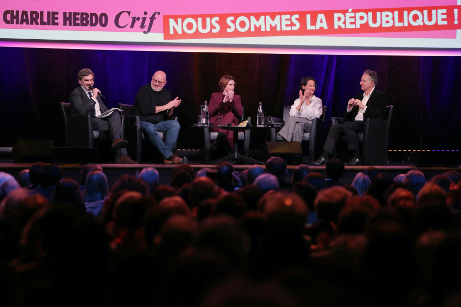 François Zimeray, Sophia Aram, Xavier Gorce, Caroline Fourest et Etienne Gernelle (AFP)