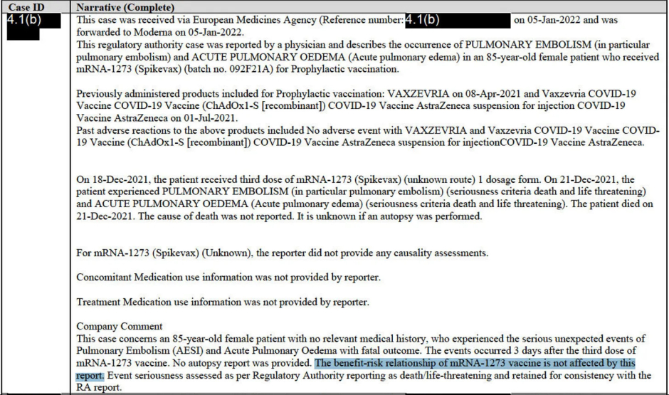 En lisant quelques pages au hasard, James Roguski est déjà tombé sur des commentaires atterrants. Parmi les signalements que Moderna a fourni à l'EMA, on note par exemple celui d'une dame âgée de 85 ans « n'ayant pas de condition médicale particulière » qui est décédée 3 jours après une vaccination. La dame avait déjà reçu deux doses de Vaxzevria d'Astra Zeneca et, pour une raison que l'on ignore, on lui avait administré Spikevax de Moderna comme 3ème vaccin.