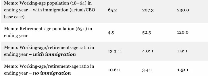 Either way, the burden of 120 million retirement age persons will be excruciating. The ratio would be 1.9:1 under baseline (i.e. status quo policy) immigration levels, but barely 1.5:1 under Trumpian ZIPG.