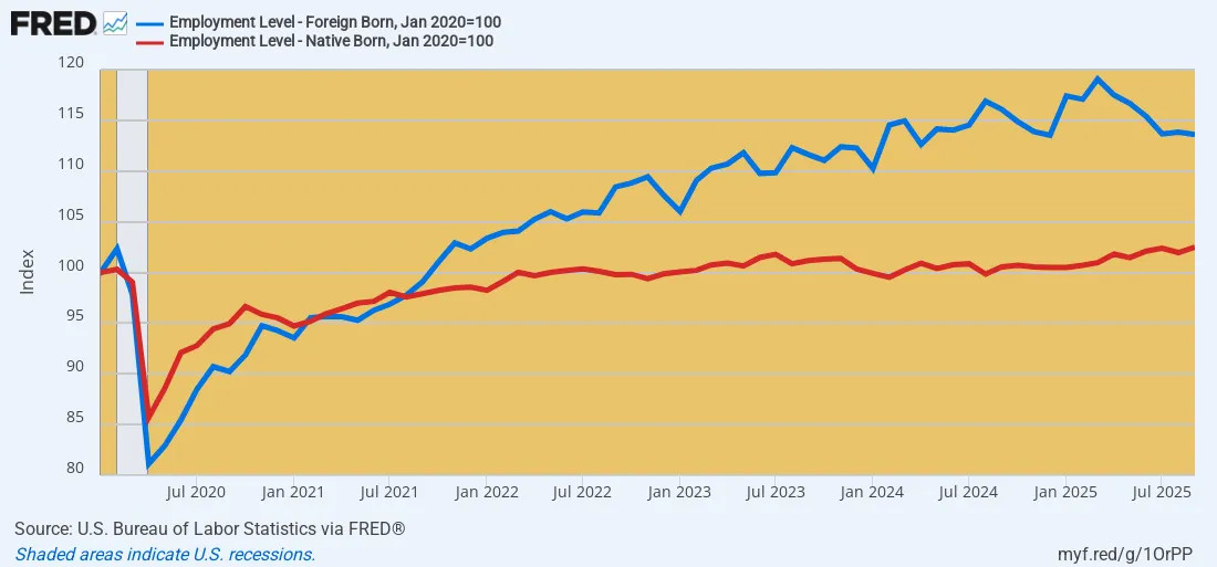 Indeed, when looked at on a longer term basis, the foreign-born source of America's current labor force growth is even more dramatic. Since the pre-crisis peak in Q4 2007 the number of foreign-born workers (blue line) employed in the US has increased by 7.6 million thru September 2025, while the far larger population of native born workers has grown by only 9.2 million (red line).