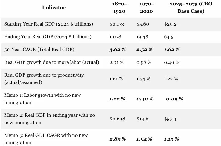 Thus, in the heyday of America's industrial expansion during 1870 to 1920, the robust average real GDP growth of 3.62% per annum reflected a 28% gain over the2.83% annual growth that was attributable to the labor force increase from the 1870 population and its offspring alone. That is, the actual contribution to real GDP growth from labor hour increases of 2.01% per annum would have been only 1.22% per year without the immigrant arrivals and their off-spring during the 50 years after 1870.