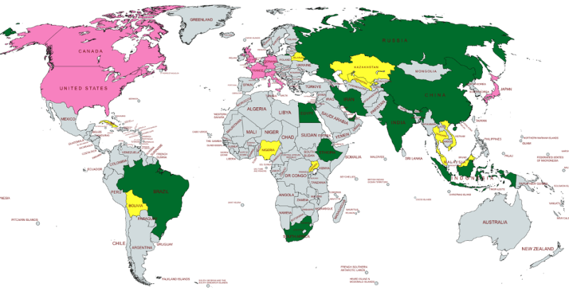 Membres du G7 - rose ; membres du BRICS - vert ; partenaires du BRICS - jaune -
