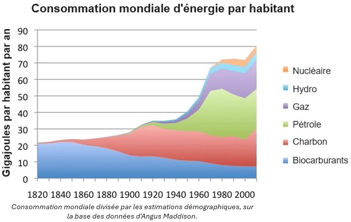 Ce dernier montre en effet un aplatissement : depuis les années 1980, la courbe s'aplatit. Le rêve d'une croissance solide s'est brisé contre un mur invisible. Aurions-nous atteint un plateau ? Certes, la consommation énergétique n'est qu'un proxy du progrès mais elle montre bien que même avec une forte augmentation de la population, elle s'est tassée. Peut-on tout mettre sur le dos d'une efficacité énergétique redoublée ?