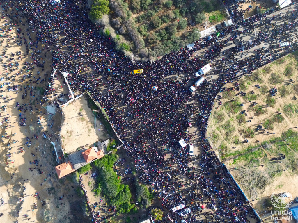Photo aérienne de Palestiniens déplacés attendant dans le nord de Nuseirat de pouvoir