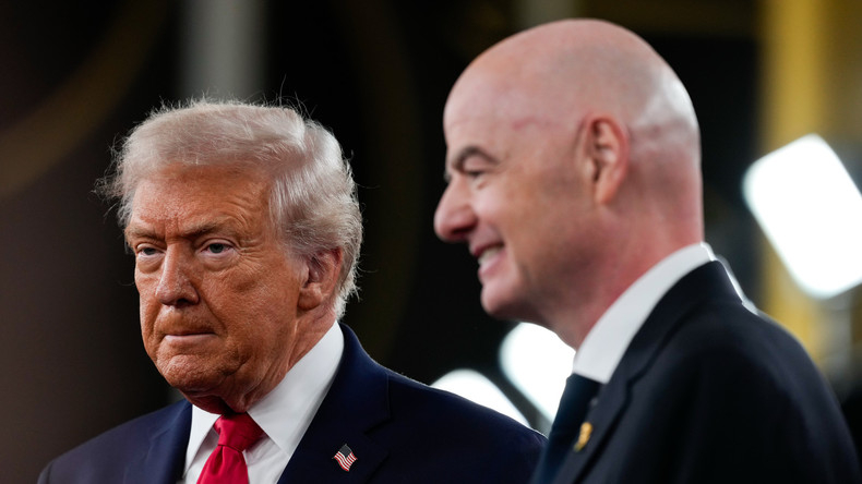 Le président Donald Trump et le président de la FIFA, Gianni Infantino, à leur arrivée pour assister au tirage au sort de la Coupe du monde de football 2026 au Kennedy Center, le 5 décembre 2025, à Washington.