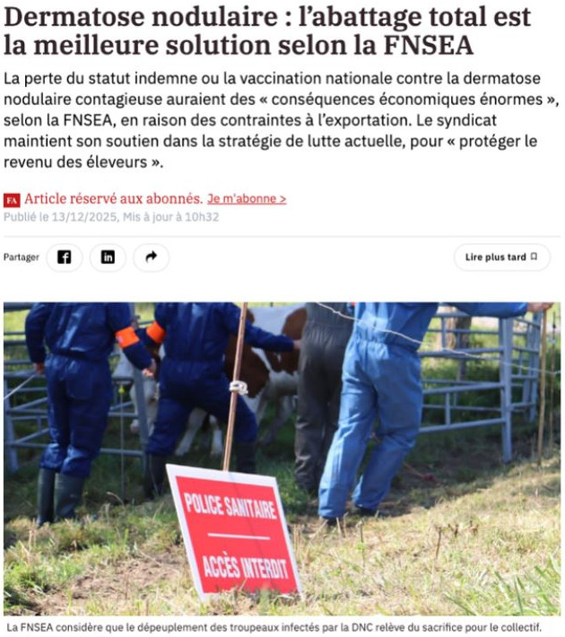 • Ces abattages massifs sont un «épouvantail» pour faire passer la pilule de la vaccination de plus d'un million de bovins :