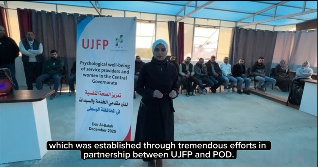 « Après plus d'un mois de travail ininterrompu et d'efforts intensifs, les équipes de l'UJFP ont achevé la construction et l'aménagement de la salle de soutien psychosocial, créée sur le toit du bâtiment de l'Organisation palestinienne pour le développement - P.O.D. Cette salle constitue un nouvel espace humain, vibrant de vie, au cœur d'une réalité lourde de crises. Cet accomplissement est survenu à un moment d'une sensibilité extrême, reflétant la détermination de l'institution et de ses équipes à poursuivre leur travail malgré tous les défis, et confirmant que la prise en charge de la santé mentale n'est plus un luxe, mais une nécessité urgente au regard des traumatismes accumulés subis par la société palestinienne à la suite de la guerre.