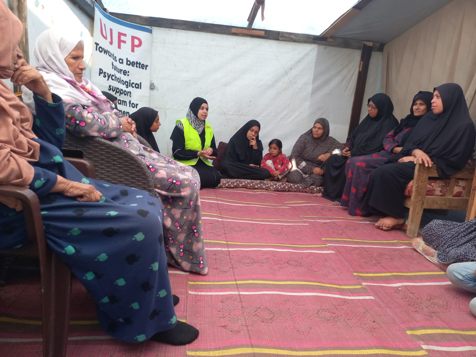 Les équipes de l'UJFP ont organisé cette semaine un atelier spécialisé de soutien psychologique dans le camp Al-Asdiqa, à l'ouest de la ville de Deir al-Balah, avec la participation de vingt-cinq femmes déplacées. Celles-ci se sont réunies dans un même espace en portant des expériences similaires de perte, de peur et de pression psychologique, mais aussi le désir de comprendre, d'apprendre et de trouver des outils leur permettant de cohabiter avec leur réalité difficile.