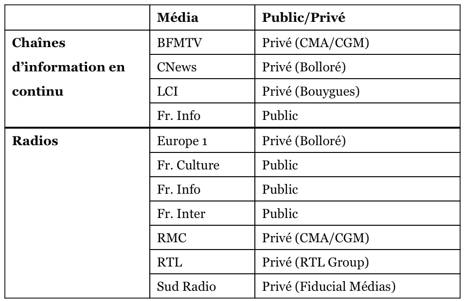 Les médias analysés sont listés dans le tableau suivant.