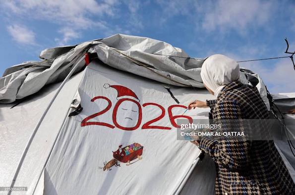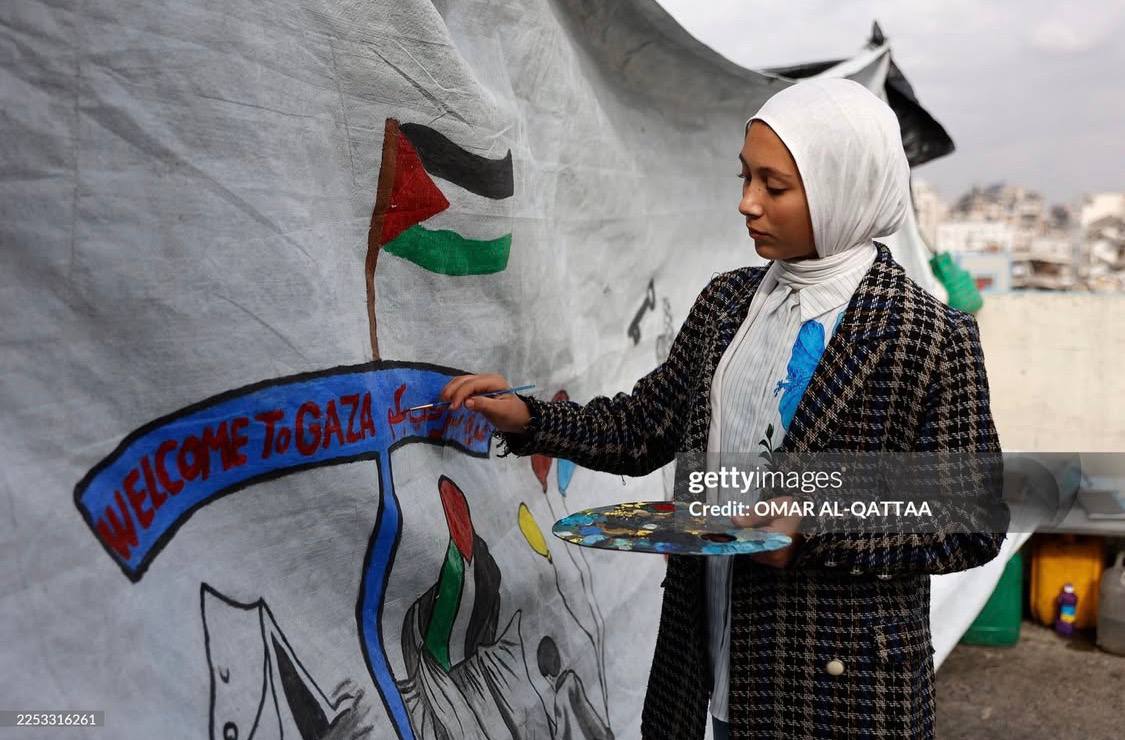 Sara Saada, une Palestinienne déplacée de quinze ans, peint sur sa tente à Gaza City après avoir été contrainte de fuir Beit Lahia, dans le nord de la bande de Gaza, en raison des bombardements israéliens.