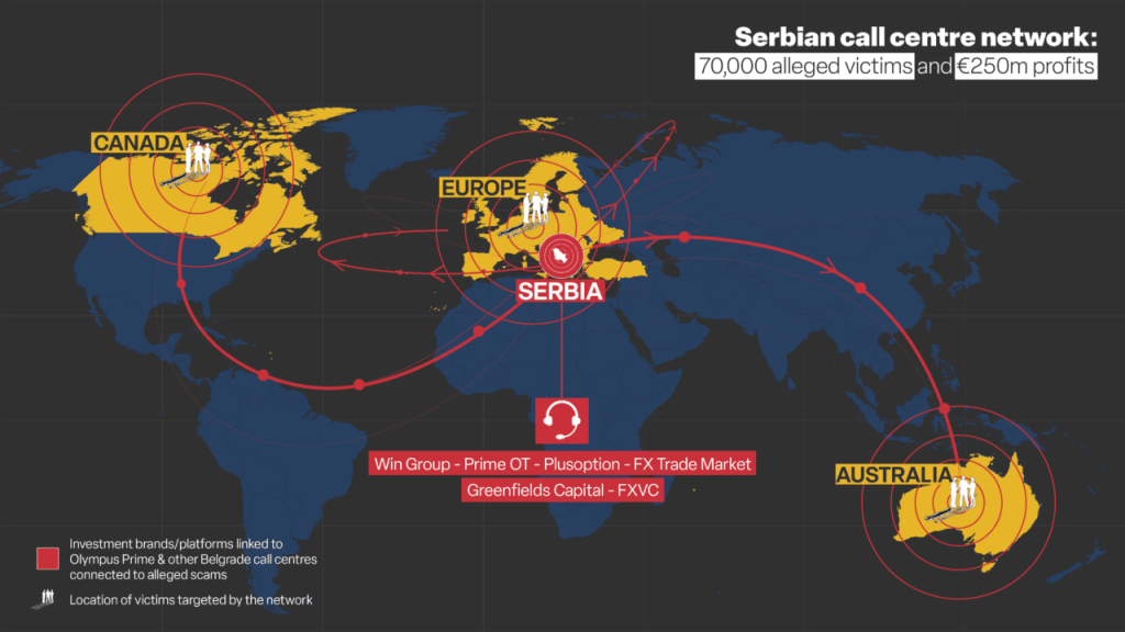 Au total, les quatre centres d'appels de Belgrade ciblaient des individus en Allemagne, en Grande-Bretagne, en Irlande, en Suisse, en Autriche, en Australie et au Canada ; les documents saisis chez Olympus Prime et consultés par IE et BIRN montrent que certains ont perdu quelques centaines d'euros, d'autres plus d'un million.
