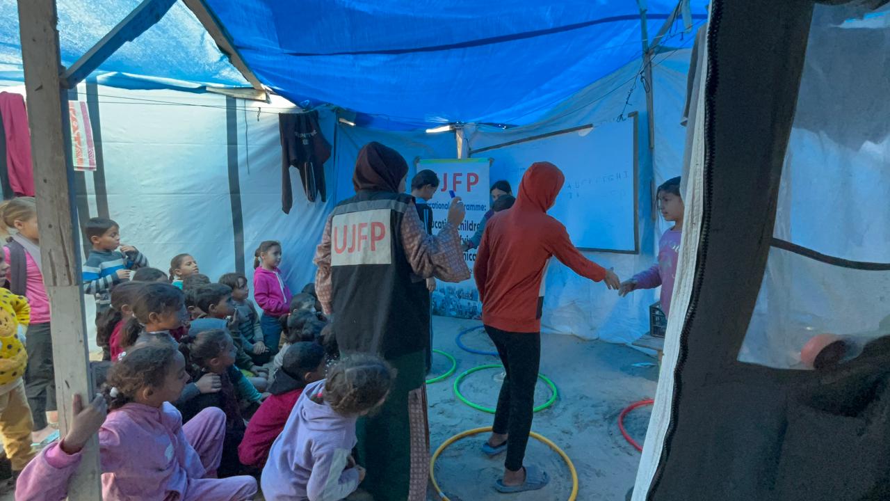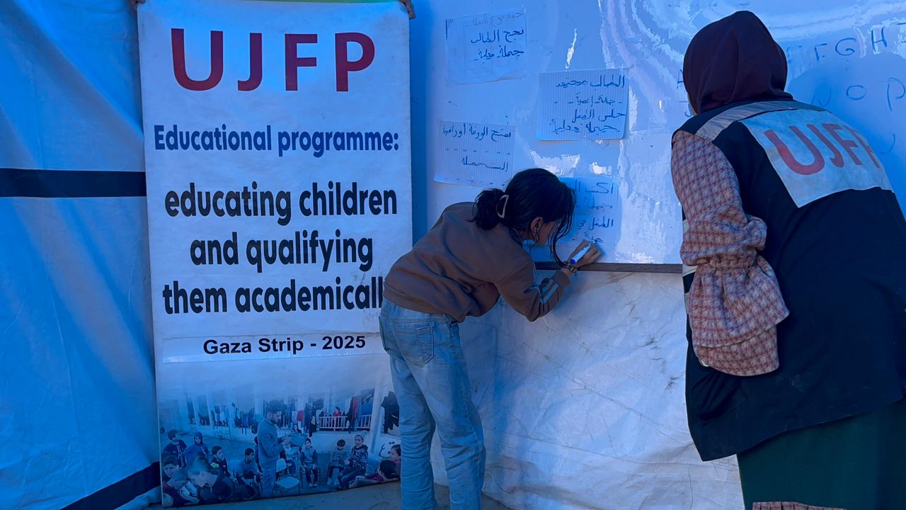 Avec la destruction du système éducatif dans la bande de Gaza et la transformation des écoles ayant échappé aux bombardements en centres d'hébergement pour les déplacés, les enfants ont perdu leur environnement scolaire. Le vide a remplacé la routine éducative, laissant des conséquences psychologiques et cognitives extrêmement dangereuses. Cette réalité a poussé des initiatives de jeunes et des institutions communautaires à agir rapidement : des centres éducatifs simples ont commencé à apparaître dans les camps de déplacement, comme une réponse naturelle à un besoin urgent qui ne pouvait attendre. Parmi ces initiatives, le rôle pionnier joué par l'UJFP se distingue. Ses équipes ne se sont pas contentées de distribuer une aide humanitaire - nourriture, vêtements et eau - mais ont regardé au-delà des besoins essentiels- prêter attention à un aspect crucial négligé en temps de crise, l'éducation.