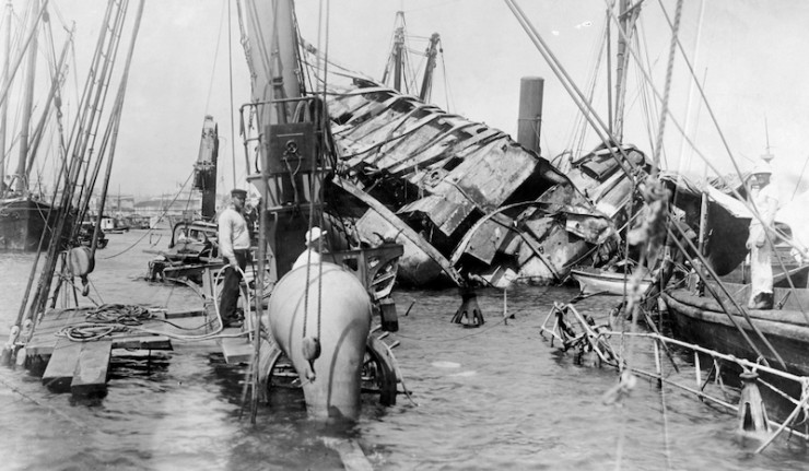 Dans la soirée du 15 février 1898, tandis que les marins à son bord ont déjà regagné leurs quartiers de nuit, l'USS Maine - amarré depuis le début du mois au port de La Havane - est touché par une violente déflagration à l'avant de sa coque. L'incendie fait rage et le croiseur s'enfonce peu à peu dans les eaux du port. Sur les 355 hommes du navire, 253 sont tués par l'explosion ou bien se noient. Les journaux des magnats de la presse William Randolph Hearst (qui donnera le «Charles Foster Kane» d'Orson Wells) et Joseph Pulitzer (le créateur du prix du même nom) font dès cet instant retentir les canons de la guerre, à coups d'enquêtes bâclées et de fausses nouvelles. Une anecdote célèbre rapporte qu'au début de l'année, alors que le dessinateur du New York Journal envoyé à La Havane s'impatientait de n'avoir rien de croustillant à se mettre sous la dent, écrivant à William Hearst : «Il n'y a pas de guerre ici, je demande à être rappelé», son patron lui aurait câblé en retour : «Restez. Fournissez les dessins, je vous fournis la guerre». De fait, la perspective d'une guerre est une aubaine pour des journaux à fort tirage comme le New York Journal fonctionnant grâce au sensationnalisme. Une nouvelle en particulier va très vite se répandre : l'USS Maine a explosé à cause d'une mine sous-marine installée par les Espagnols sous la coque du navire. L'hypothèse d'une explosion dans la soute à poudres du navire, interne à celui-ci donc, est en revanche totalement exclue.
