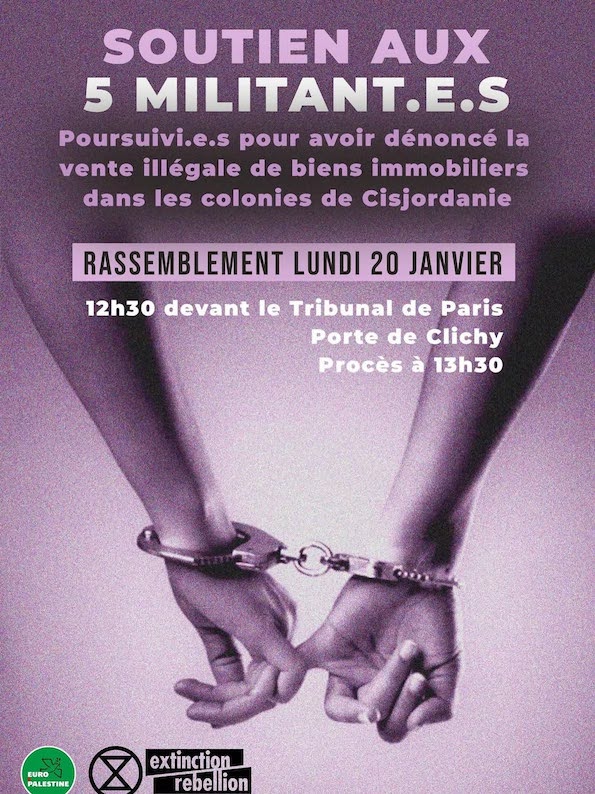 Le procès des cinq militant(e)s, qui ont mis une flaque de peinture rose (lavable) devant les Salons Hoche (75008 Paris), afin de dénoncer leur accueil d'un salon immobilier colonial, aura lieu le 20 janvier à 13 H 30 au tribunal de la Porte de Clichy à Paris.