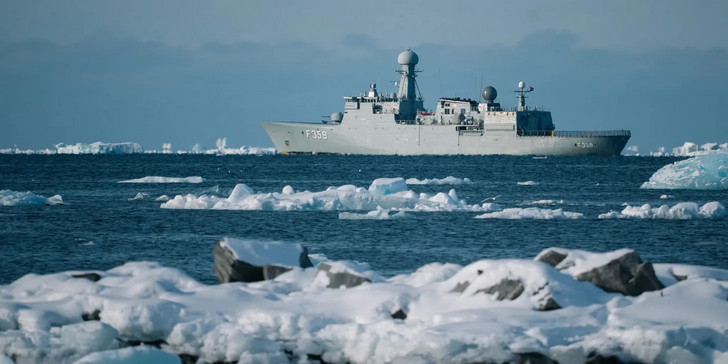 Le navire de guerre HDMS Vaedderen de classe Thetis de la Marine royale danoise au large des côtes de Nuuk, au Groenland, le 2 avril 2025. Photo © Juliette Pavy/Bloomberg via Getty Images