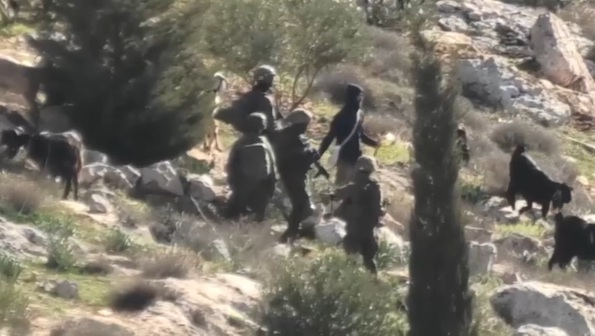 Sous la protection de l'armée israélienne, les colons ont amené leur bétail pour qu'il pâture parmi des arbres fruitiers sur des terres palestiniennes à Al-Mughayyir, au nord-est de Ramallah.