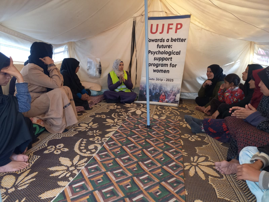 Dans une tentative d'alléger le poids de la douleur qui pesait sur le lieu, l'atelier a inclus une activité récréative simple, basée sur des exercices légers, des questions interactives et des rires collectifs, offrant aux femmes de rares moments de joie.