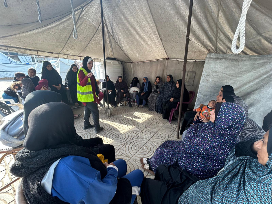 La séance de soutien psychologique mise en œuvre par l'équipe de l'UJFP dans le camp d'Al-Ard Al-Katiba, à l'ouest de la ville de Gaza, en présence de 30 femmes déplacées : Malgré le déplacement, nous sommes plus fortes, notre voix, c'est la vie.