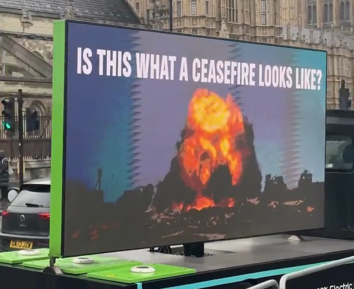 A Westminster, au Royaume-Uni, les militants ont installés de grands écrans pour montrer à la population que l'on nous ment, et que le génocide continue à Gaza.